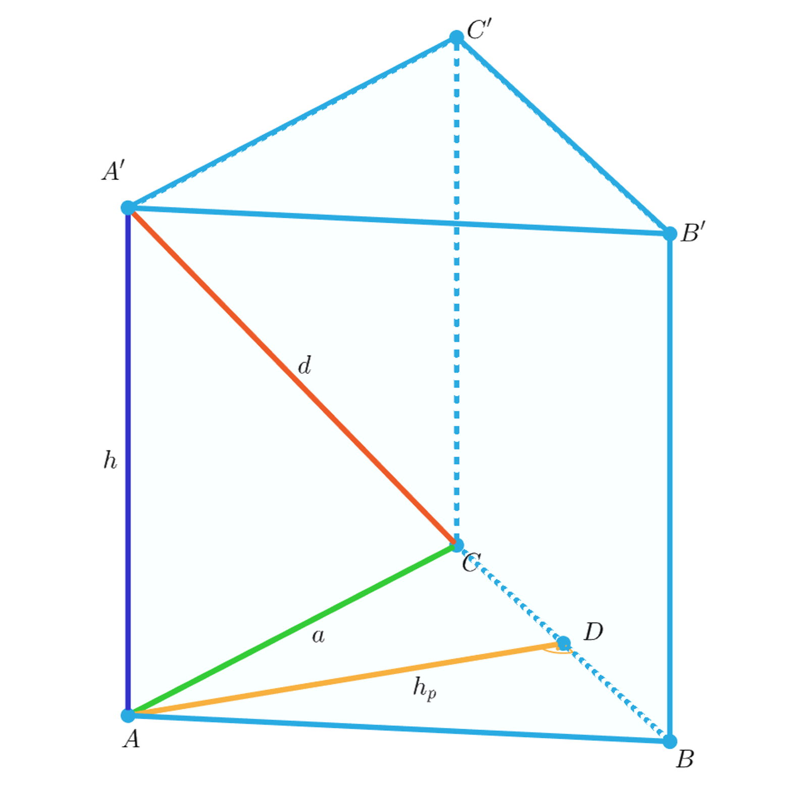 Poniżej zajmiemy się więc bardziej skomplikowanymi przypadkami kątów pomiędzy odcinkami w graniastosłupie prawidłowym trójkątnym.