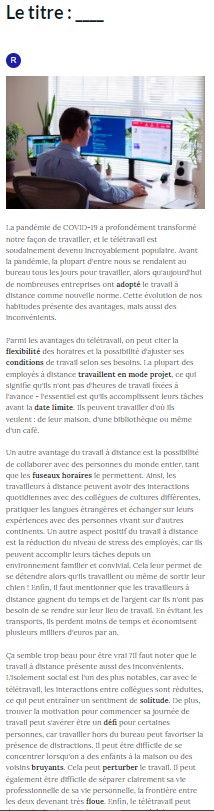 Il y a quelques années, le travail à distance n'était pas très populaire. Tout a changé pendant la pandémie qui a bouleversé nos habitudes de travail. Le télétravail fait‑il toujours rêver aujourd'hui ? Lis le texte et fais les exercices.