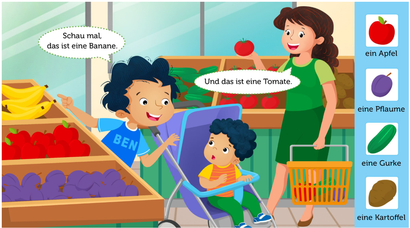Ben z mamą i braciszkiem wybrali się do sklepu. Jakie warzywa i owoce kupują?Ben z mamą i braciszkiem wybrali się do sklepu. Jakie warzywa i owoce kupują?