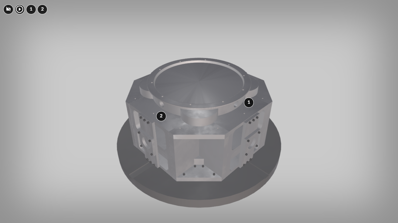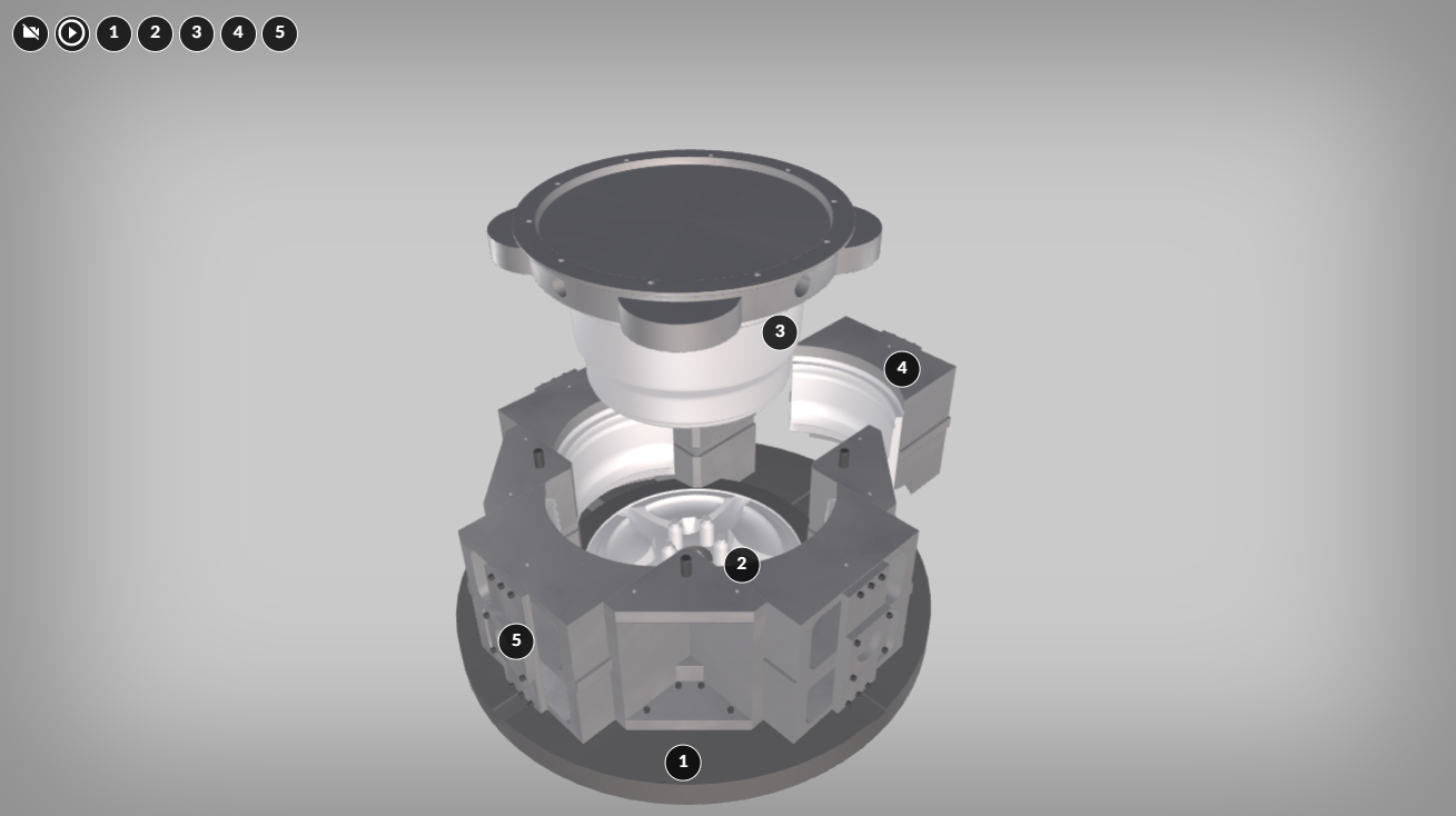 Wizualizacja 3D przedstawia otwartą kokilę przeznaczoną do odlewania felg aluminiowych pod niskim ciśnieniem. Na wizualizacji znajduje się pięć punktów interaktywnych, po kliknięciu na które pojawia się nazwa elementów składających się na formę kokilową. Po wybraniu danej cyfry pojawia się ramka z tekstem. Tekst jest tożsamy z ewentualnym nagraniem audio.