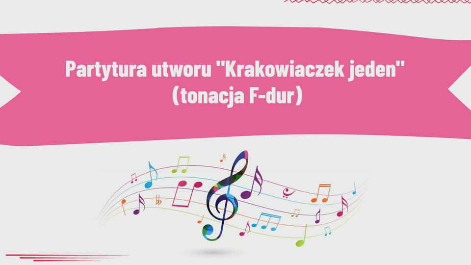 Animacja przedstawia interaktywną partyturę utworu "Krakowiaczek jeden" (tonacja F‑dur). Plansza tytułowa zawiera tytuł wspomnianego utworu oraz ilustrację, przedstawiającą pięciolinię z kluczem wiolinowym i nutami w różnych kolorach. W trakcie trwania animacji, w synchronizacji ze ścieżką dźwiękową, na pięciolinii pojawiają się kolorowe nuty. Pierwsza partia w systemie to melodia, druga to akompaniament. Przy kluczu wiolinowym, na trzeciej linii znajduje się bemol. Metrum utworu to dwie czwarte. Pierwszy takt w linii melodii składa się z czterech ósemek, połączonych po dwie, z dźwiękami: e, g, h, d (z drugiej oktawy). Następny takt składa się z ósemki c, ćwierćnuty a i pauzy ósemkowej. Dalej znowu są cztery ósemki, połączone po dwie, z dźwiękami: c, c, h, g. Następnie ósemka f, ćwierćnuta a i pauza ósemkowa. W drugiej linijce partii melodii trzy pierwsze takty są identyczne jak w pierwszej, natomiast ostatni takt zawiera dwie ćwierćnuty f, f. Partia akompaniamentu w obu linijkach jest taka sama i składa się z samych półnut (po jednej w każdym takcie) z dźwiękami: c, f, c, f.