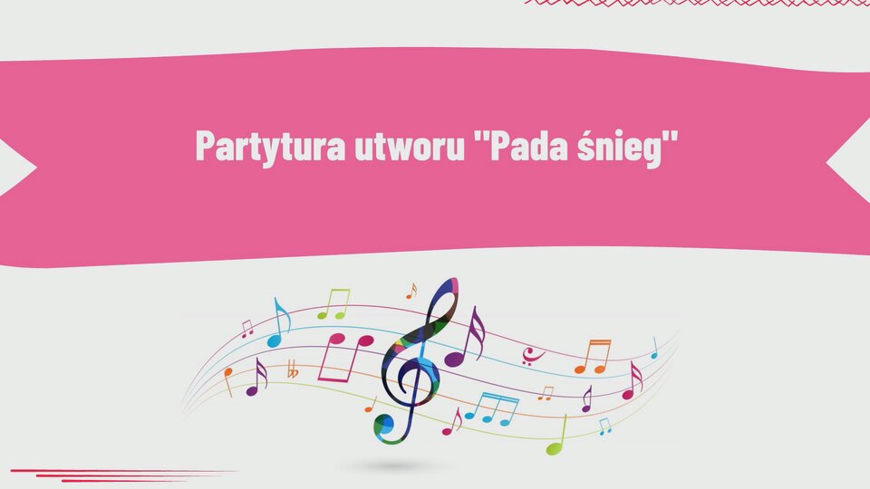 Animacja przedstawia interaktywną partyturę utworu "Pada śnieg". Na początku na ekranie wyświetla się tytuł animacji, wypisany białą czcionką na różowym tle: „Partytura utworu "Pada śnieg"”. Reszta ekranu jest biała. Pod tytułem znajduje się ilustracja przedstawiająca różnokolorowe nuty oraz klucz wiolinowy, porozrzucane po pięciolinii wygiętej w kształt fali. W trakcie odtwarzania utworu miarowo pojawiają się nuty w dwóch pięcioliniach: pierwsza należy do partii melodii, natomiast druga do partii akompaniamentu. Utwór jest napisany w metrum cztery czwarte, w tonacji C‑dur. Ma łącznie szesnaście taktów. Po zakończeniu odtwarzania utworu w pięcioliniach są już kompletne partie ze wszystkimi nutami. W partii melodii w pierwszym takcie na pierwszą miarę grana jest żółta ćwierćnuta e, następnie ponownie żółta ćwierćnuta e na drugą miarę, a na miary trzecią oraz czwartą zapisano żółtą półnutę e. Takt drugi w partii melodii jest dokładnie taki sam, jak takt pierwszy: na pierwsze dwie miary zapisano dwie żółte ćwierćnuty e, natomiast na miary trzecią oraz czwartą żółtą półnutę e. W trzecim takcie na pierwszą miarę zapisano żółtą ćwierćnutę e, na miarę drugą ciemnozieloną ćwierćnutę g, na trzecią miarę zieloną ćwierćnutę c, natomiast na miarę czwartą pomarańczową ćwierćnutę d. W czwartym takcie na pierwszą miarę wykonywana jest żółta cała nuta e. W takcie piątym na wszystkie miary grane są cztery jasnozielone ćwierćnuty f. W szóstym takcie na pierwszą miarę zapisano jasnozieloną ćwierćnutę f, a na miary od drugiej do czwartej żółte ćwierćnuty e. W siódmym takcie na pierwszą miarę zapisano żółtą ćwierćnutę e, na miarę drugą oraz trzecią po pomarańczowej ćwierćnucie d, a na czwartą miarę żółtą ćwierćnutę e. W takcie ósmym na pierwszą miarę zapisano pomarańczową półnutę d, a następnie na miarę trzecią ciemnozieloną półnutę g, przy czym zmiana z jednego dźwięku na drugi następuje z artykulacją legato. Takt dziewiąty rozpoczyna się od żółtej ćwierćnuty e granej na pierwszą miarę, na miarę drugą zapisano ponownie żółtą ćwierćnutę e, a na miary trzecią oraz czwartą żółtą półnutę e. Podobnie jest w takcie dziesiątym: najpierw na pierwsze dwie miary zapisano dwie żółte ćwierćnuty e, a dalej żółtą półnutę e. W takcie jedenastym na pierwszą miarę grana jest żółta ćwierćnuta e, na miarę drugą ciemnozielona ćwierćnuta g, na trzecią miarę czerwona ćwierćnuta c, a na miarę czwartą pomarańczowa ćwierćnuta d. W dwunastym takcie wykonywana jest wyłącznie żółta cała nuta e. W trzynastym takcie na każdą miarę zapisano po jasnozielonej ćwierćnucie f. W takcie czternastym na pierwszą miarę grana jest jasnozielona ćwierćnuta f, a dalej, na miary od drugiej do czwartej, zapisano po żółtej ćwierćnucie e. W takcie piętnastym na pierwsze dwie miary wykonywane są dwie ciemnozielone ćwierćnuty g, na miarę trzecią jasnozielona ćwierćnuta f, a na miarę czwartą zapisano pomarańczową ćwierćnutę d. W ostatnim, szesnastym takcie partii melodii grana jest czerwona cała nuta c. W partii akompaniamentu wszystkie dźwięki to całe nuty. W pierwszych czterech taktach są to czerwone całe nuty c, w takcie piątym jasnozielona cała nuta f, w taktach szóstym oraz siódmym ponownie czerwone cała nuta c, a w ósmym takcie ciemnozielona cała nuta g. W taktach od dziewiątego do dwunastego ponownie zapisano na czerwono cała nuta c, w trzynastym jasnozieloną cała nuta f. W czternastym takcie grana jest czerwona cała nuta c, w piętnastym takcie ciemnozielona cała nuta g, a w takcie szesnastym po raz kolejny czerwona cała nuta c.