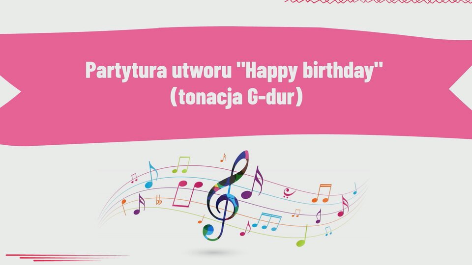 Animacja przedstawia interaktywną partyturę utworu "Happy birthday" (tonacja G‑dur). Plansza tytułowa zawiera tytuł wspomnianego utworu oraz ilustrację, przedstawiającą pięciolinię z kluczem wiolinowym i nutami w różnych kolorach. W trakcie trwania animacji, w synchronizacji ze ścieżką dźwiękową, na pięciolinii pojawiają się kolorowe nuty. Pierwsza partia w systemie to melodia, druga to akompaniament. Przy kluczu wiolinowym, na piątej linii znajduje się krzyżyk. Metrum utworu to trzy czwarte. Pierwszy takt w linii melodii składa się z dwóch ósemek d, d. W następnym takcie są trzy ćwierćnuty: e, d, g. W kolejnym jest ćwierćnuta z dźwiękiem f, pauza ćwierćnutowa i dwie ósemki d, d. Następny takt zawiera trzy ćwierćnuty: e, d, a. Ostatni takt w tej linii melodii zawiera ćwierćnutę g, pauzę ćwierćnutową i dwie ósemki d, d. Drugą linijkę partii melodii rozpoczyna takt z ćwierćnutą z dźwiękiem d w drugiej oktawie, ćwierćnutą z dźwiękiem h i dwoma ósemkami f, f. W kolejnym takcie znajduje się ćwierćnuta f, ćwierćnuta e i dwie ósemki c, c. Następnie mamy trzy ćwierćnuty: h, g, a. Ostatni takt to półnuta z kropką z dźwiękiem g. Partia akompaniamentu składa się w pierwszym takcie z pauzy ćwierćnutowej, w kolejnym jest półnuta z kropką z dźwiękiem g. W kolejnych dwóch taktach znajduje się po jednej półnucie z kropką z dźwiękiem d. W kolejnym takcie jest półnuta z kropką z dźwiękiem g. W drugiej linijce partii akompaniamentu, w każdym takcie jest tylko półnuta z kropką z dźwiękami kolejno: g, c, g, g.