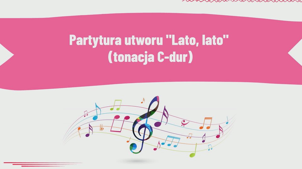 Animacja przedstawia interaktywną partyturę utworu "Lato, lato" (tonacja C‑dur). Plansza tytułowa zawiera tytuł wspomnianego utworu oraz ilustrację, przedstawiającą pięciolinię z kluczem wiolinowym i nutami w różnych kolorach. W trakcie trwania animacji, w synchronizacji ze ścieżką dźwiękową, na pięciolinii pojawiają się kolorowe nuty. Pierwsza partia w systemie to melodia, druga to akompaniament. Metrum utworu to cztery czwarte. Pierwszy takt w linii melodii składa się z dwóch półnut z dźwiękiem g. Następny zawiera ćwierćnutę e i półnutę z kropką z dźwiękiem g. Kolejny takt to półnuta z dźwiękiem a i półnuta z dźwiękiem g. Następny zawiera ćwierćnutę f i półnutę z kropką z dźwiękiem d. Druga linijka partii melodii zaczyna się taktem z dwoma półnutami f. Kolejny takt zawiera ćwierćnutę d i półnutę z kropką z dźwiękiem f. W następnym są dwie półnuty g, f. Dalej ćwierćnuta e i półnuta z kropką z dźwiękiem c. Kolejny takt to dwie półnuty g. Następny to ćwierćnuta e i półnuta z kropką z dźwiękiem g. Trzecia linijka partii melodii rozpoczyna się taktem z dwoma półnutami c, a. W kolejnym takcie jest cała nuta g. Następny składa się z czterech ćwierćnut: f, g, a, f. Przedostatni takt to dwie półnuty: e, c. Ostatni takt składa się z całej nuty z dźwiękiem d. Partia akompaniamentu w pierwszych trzech taktach zawiera po jednej całej nucie z dźwiękiem c. Ostatni takt pierwszej linijki to cała nuta z dźwiękiem f. W drugiej linijce partii akompaniamentu, pierwsze trzy takty zawierają po jednej całej nucie z dźwiękiem f. Trzy kolejne takty zawierają po jednej całej nucie z dźwiękiem c. W ostatniej linijce partia akompaniamentu zawiera kolejno w taktach: całą nutę f, całą nutę c, całą nutę f, całą nutę c, całą nutę g.
