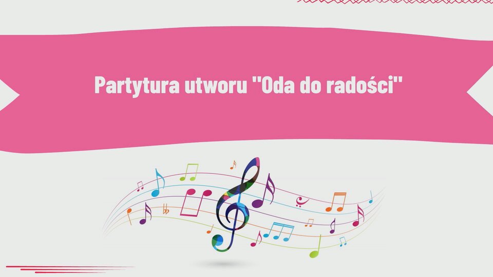 Animacja przedstawia interaktywną partyturę utworu "Oda do radości". Plansza tytułowa zawiera tytuł wspomnianego utworu oraz ilustrację, przedstawiającą pięciolinię z kluczem wiolinowym i nutami w różnych kolorach. W trakcie trwania animacji, w synchronizacji ze ścieżką dźwiękową, na pięciolinii pojawiają się kolorowe nuty. Pierwsza partia w systemie to melodia, druga to akompaniament. Metrum utworu to cztery czwarte. Pierwszy takt w linii melodii składa się z czterech ćwierćnut: e, e, f, g. Następny takt to cztery ćwierćnuty: g, f, e, d. Kolejny to cztery ćwierćnuty: c, c, d, e. Następny takt składa się z ćwierćnuty z kropką z dźwiękiem e, ósemki z dźwiękiem d, ćwierćnuty z dźwiękiem d i pauzy ćwierćnutowej. W drugiej linijce partii melodii pierwsze trzy takty są identyczne jak w pierwszej, natomiast ostatni takt to ćwierćnuta z kropką z dźwiękiem d, ósemka z dźwiękiem c, ćwierćnuta z dźwiękiem c i pauza ćwierćnutowa. Partia akompaniamentu w pierwszej linijce składa się wyłącznie z całych nut z dźwiękami kolejno w taktach: c, g, c, g. W drugiej linijce partia akompaniamentu dla pierwszych trzech taktów jest identyczna, a w ostatnim znajdują się dwie półnuty: g, c.