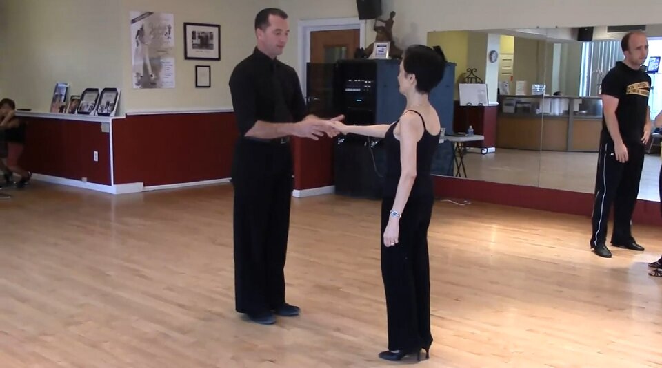 Pary wykonują 4 kroki w przód, obrót i 4 kroki w tył.