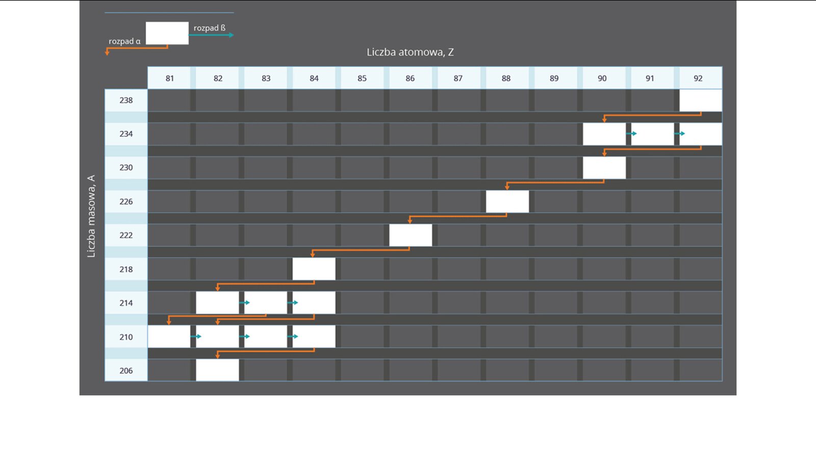 Szereg promieniotwórczy uranowo‑radowy. Czasami nowo powstałe jądro jest niestabilne i ulega kolejnym rozpadom tak długo, dopóki w efekcie przemian nie powstanie jądro stabilne.