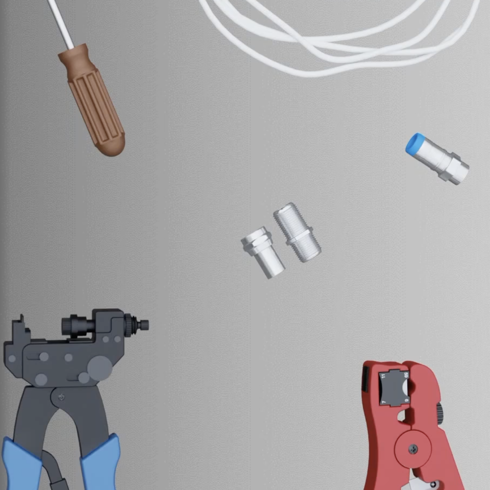 Wizualizacje 3D „Budowa kabla koncentrycznego”, „Budowa gniazda abonenckiego”, „Narzędzia i elementy montażowe do montażu gniazd” przedstawią ci budowę kabla koncentrycznego, budowę gniazda abonenckiego oraz budowę narzędzi służących do montażu gniazd.