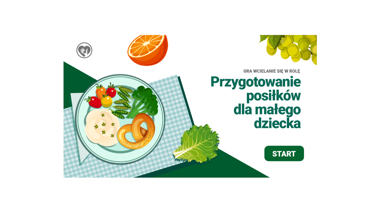Gra wcielanie się w rolę “Przygotowywanie posiłków dla małego dziecka” rozpoczyna się ekranem startowym. Klikając przycisk Start, gracz przechodzi do zasad i celów gry.
