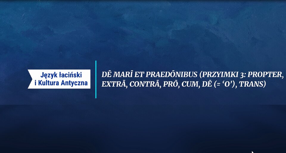 Film animowany o tematyce dydaktycznej przytacza i omawia użycie wybranych przyimków łacińskich. Na pierwszym ekranie pojawia się tytuł filmu: Dē marī et praedōnibus (przyimki 3: propter, extrā, contrā, prō, cum, dē (= ‘o’), trans). Następna grafika przedstawia szkołę. Jest to piętrowy budynek w kolorze czerwonym. Wokół rośnie trawa. Nad wejściem znajduje się napis SZKOŁA. Następne ujęcie ukazuje korytarz szkolny, a w nim uchylone drzwi do sali lekcyjnej. Kolejna scena rozgrywa się przy tablicy. Po jej lewej stronie stoi nauczyciel ze wskaźnikiem w dłoni, po prawej uczeń. Na tablicy jest napisany temat lekcji: Dē marī et praedōnibus (przyimki 3: propter, extrā, contrā, prō, cum, dē (= ‘o’), trans. Następny slajd ukazuje morze, nad którym fruwa mewa. Poniżej znajduje się podpis: MARE. Nauczyciel mówi: Graecī et Rōmānī antiquī prope mare vivēbant. Multī eōrum erant nautae aut piscatores. Uczeń pyta: Quī sunt nautae et piscatōrēs? Na następnym slajdzie przedstawieni są rybacy na morzu. W centrum obrazu znajduje się dwóch nagich mężczyzn w niewielkiej łodzi. Jeden rozkłada sieci, drugi wiosłuje. Wokół pływa mnóstwo ryb. Obok rybaka widnieje podpis PISCATOR. Nauczyciel mówi: Piscatōrēs in marī piscēs et alia animālia capiunt. Na następnym ekranie ukazany jest rysunek dużej ryby. Pod nią znajduje się napis: PISCIS. Uczeń mówi: Piscēs sciō, sed quae alia animālia in marī capiuntur? Na kolejnym ekranie przedstawiono wazy czarnofigurowe. Znajdująca się na pierwszym planie ozdobiona jest malowidłem ośmiornicy. Poniżej widnieje podpis: POLYPUS. Nauczyciel mówi: Animalia, quae a piscatōribus capiuntur, sunt inter alia pōlypi. Uczeń pyta: Quā dē causā piscatōrēs piscēs et pōlypos capiunt? Następna ilustracja przedstawia ryby pieczone na ruszcie. Nauczyciel mówi: Quia nōs hominēs piscēs et pōlypos edimus. Uczeń pyta: Bene. Et nautae, quī sunt? Na kolejnym ekranie ukazana jest płaskorzeźba przedstawiająca żeglarza na statku. Nad żeglarzem znajduje się napis: NAUTA, na statku: NAVIS. Nauczyciel mówi: Nautae nāvibus per mare nāvigant. Kolejna ilustracja przedstawia mozaikę. W jej centrum widnieje okręt z rozpiętymi żaglami. Obok pływają ryby. Pod spodem znajduje się napis: NAVIS MERCATORIA. Nauczyciel mówi: Nāvēs mercātōriae rēs variās trans mare transportant. Uczeń pyta: Quās rēs? Na następnym ekranie przedstawiono artykuły spożywcze: zboże, przyprawy, oliwę. Nauczyciel odpowiada: Frūmentum, olīvam, condīmenta multaque alia. Kolejna ilustracja ukazuje okręt wojenny. Ma rozpięte żagle; do burty przymocowane są wiosła. Podpis głosi: NAVIS BELLICA. Nauczyciel opowiada: Nāvēs bellicae autem prō patriā pugnant. Na następnym ekranie ukazane są trzy fotografie. Przedstawiają one kolejno łódź rybacką, statek handlowy i okręt. Pod nimi znajdują się podpisy w języku polskim oraz odnoszące się do nich fragmenty łacińskiej wypowiedzi nauczyciela. Nauczyciel mówi: Sed sunt quoque aliī nautae, qui nec piscēs capiunt nec rēs transportant nec prō patriā pugnant. Kolejna ilustracja ukazuje pirata. W skrzyżowanych dłoniach trzyma pistolety, na głowie ma charakterystyczny piracki kapelusz. Podpis głosi: PIRATA VEL PRAEDO. Uczeń pyta: Quī sunt? Nauczyciel odpowiada: Sunt pīrātae vel praedōnes.