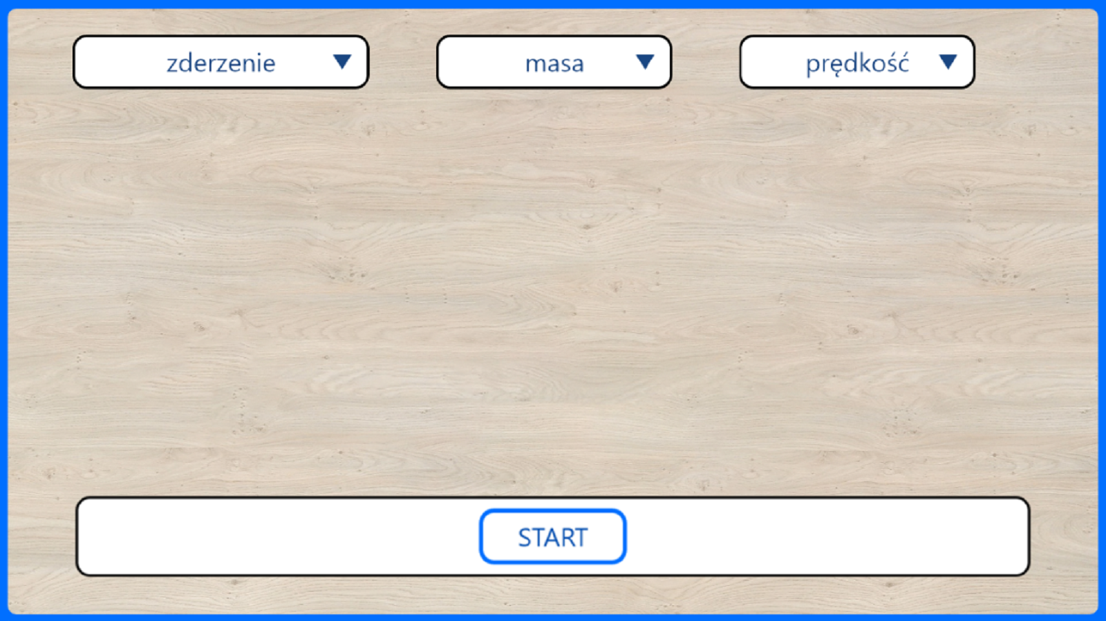 Symulacja. Do wyboru parametry: rodzaj zderzenia, masy ciał zderzających się oraz prędkości ciał zderzających się.