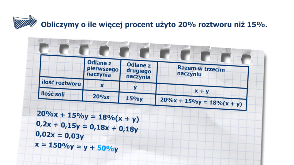 W pierwszym naczyniu znajduje się dwudziestoprocentowy roztwór wodny soli, w drugim – roztwór wodny soli o stężeniu . Do trzeciego, początkowo pustego naczynia, przelano pewną ilość pierwszego roztworu, po czym dolano taką ilość roztworu z drugiego naczynia, że w trzecim naczyniu otrzymano roztwór o stężeniu . W ten sposób do trzeciego naczynia przelano z pierwszego o więcej roztworu niż z drugiego naczynia.