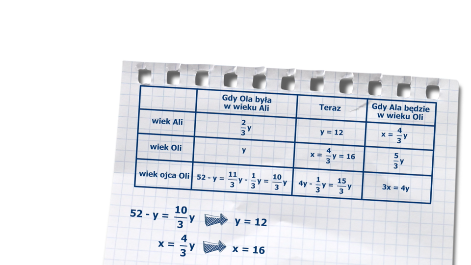 Ala spytała starszą koleżankę Olę: „Ile masz lat, Olu?”. Ola odpowiedziała: „Gdy ty będziesz w moim wieku, mój ojciec będzie od ciebie razy starszy. Gdy ja byłam w twoim wieku, mieliśmy razem z moim ojcem lata, a twój wiek stanowił dwie trzecie mojego.” Obliczymy, ile lat ma Ola.