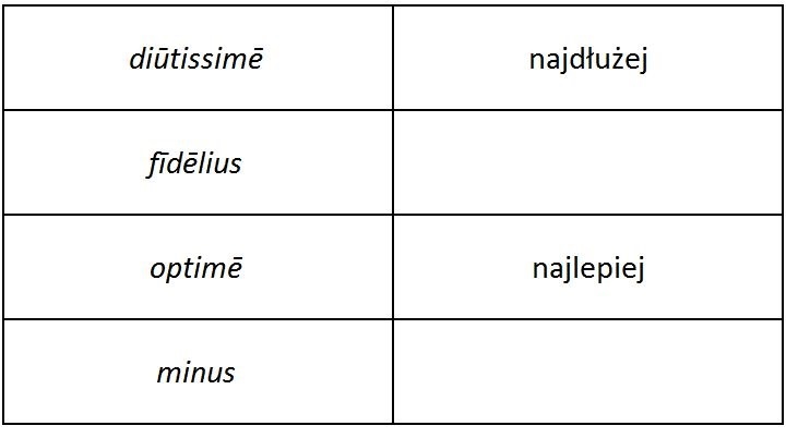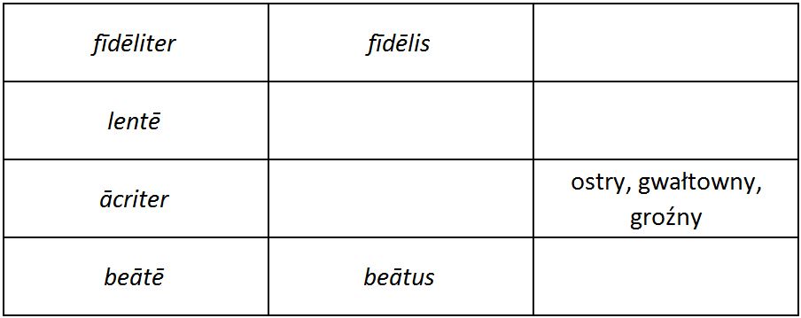 Obok przysłówków podanych po polsku wstaw (przeciągając spośród podanych pod tabelą) ich łacińskie odpowiedniki.