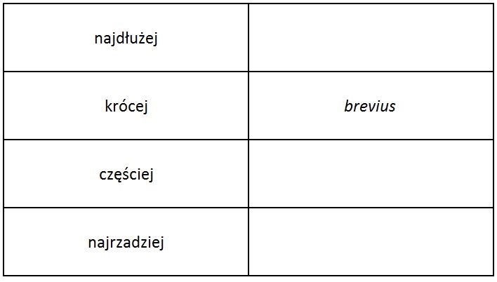 (brevis –e krótki) > brevissimus –a –um najkrótszy –a –e > brevissimē najkrócej