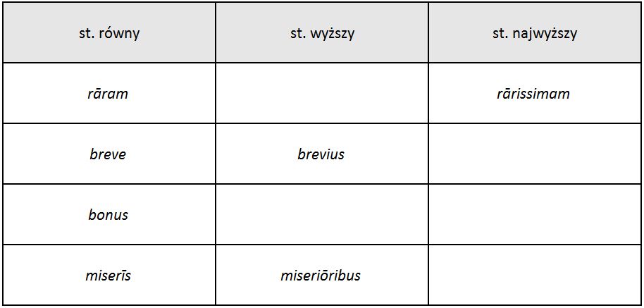 f) zasady stopniowania regularnego przymiotników deklinacji I – III oraz stopniowania nieregularnego następujących przymiotników: bonus, malus, parvus, magnus, multi,