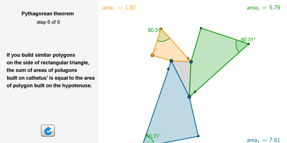 Geogebra aplet - Twierdzenie Pitagorasa dla podobnych trójkątów. Galeria z opisami alternatywnymi poniżej.