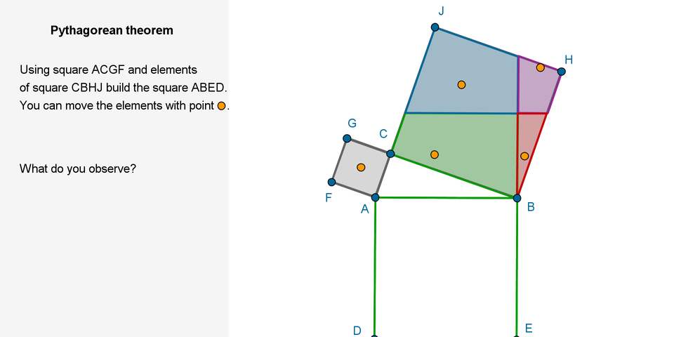 Geogebra aplet - Twierdzenie Pitagorasa. Galeria z opisami alternatywnymi poniżej.