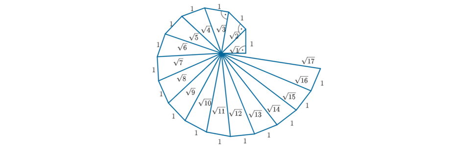 Rysunek przedstawia trójkąt prostokątny o przyprostokątnych 1 i pierwiastek kwadratowy z 1. Przeciwprostokątna takiego trójkąta na mocy twierdzenia Pitagorasa jest równa pierwiastek kwadratowy z 2. Przeciwprostokątna tego trójkąta prostokątnego jest przyprostokątną kolejnego trójkąta prostokątnego. Druga przyprostokątna nowego trójkąta jest równa 1. Przeciwprostokątna trójkąta prostokątnego o przyprostokątnych równych 1 i pierwiastek kwadratowy z 2 to pierwiastek kwadratowy z 3. Procedura to została powtórzona 17 razy. Powstająca w ten sposób figurę nazywa się ślimakiem Teodorusa. Rysunek przedstawia ślimak Teodorusa dla n = 17.