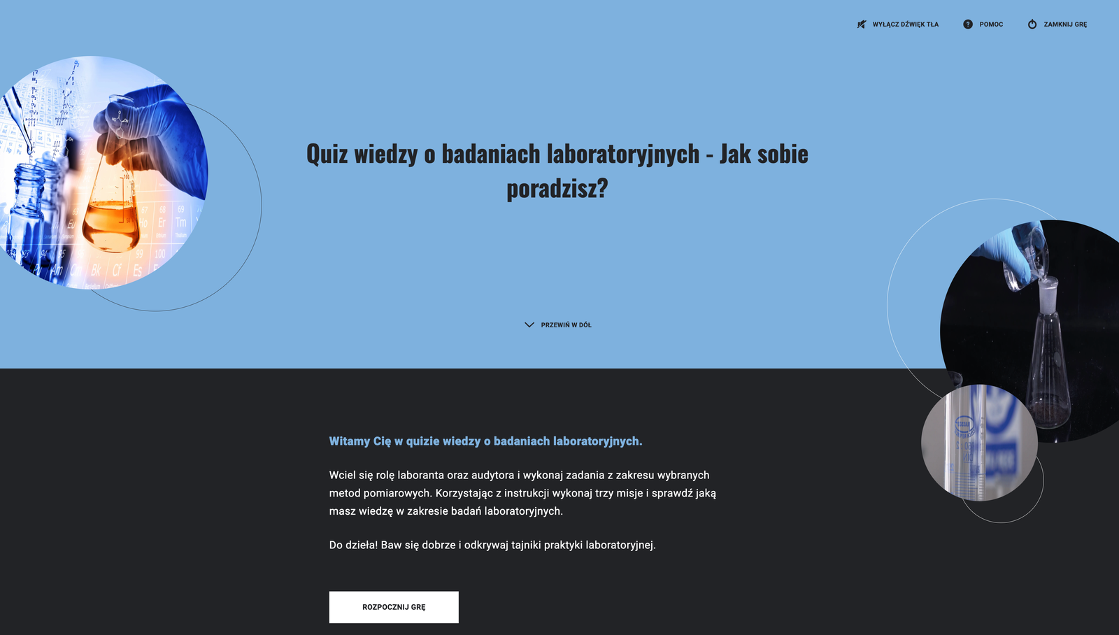 Gra umożliwia wcielenie się w rolę laboranta oraz audytora laboratoryjnego. Celem gry jest nauka oraz utrwalanie wiedzy z zakresu metod pomiarowych, aparatury badawczej oraz informacje na temat norm, procedur i systemów akredytacji. W trakcie gry będziesz miał możliwość rozwiązywania zadań opierających się na wizualnej analizie grafik aparatów wykorzystywanych w laboratorium oraz opisach ich działania.