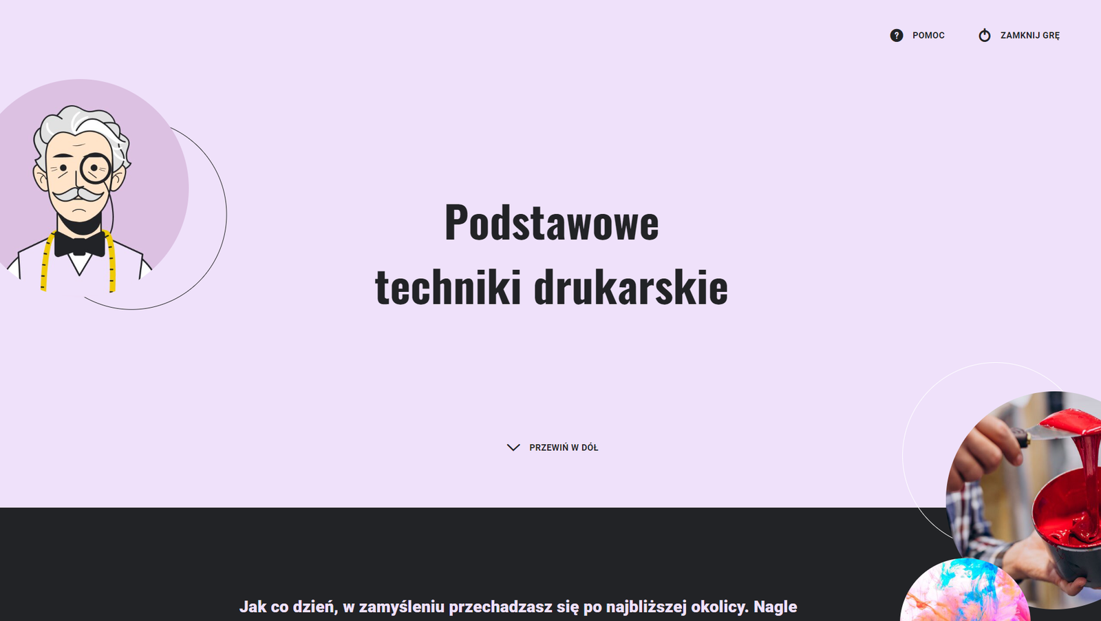 Grafika przedstawia ekran główny gry. W górnej części tekst: “Witaj ponownie w grze Podstawowe techniki drukarskie”. Poniżej dwa przyciski w formie prostokątów. Pierwszy to kontynuuj grę, a drugi rozpocznij nową grę. W prawym, górnym rogu znajdują się dwa przyciski funkcyjne. Pierwszy w formie znaku zapytania w kole to pomoc. Służy do przejścia do ekranu pomocy. Drugi przycisk to zamknij grę. Służy do wyjścia z gry. W dolnej części tekst: “Jak co dzień, w zamyśleniu przechadzasz się po najbliższej okolicy. Nagle orientujesz się, że nogi zaniosły Cię w nieoczekiwane miejsce… Przed sobą widzisz budynek, który lata świetności ma już dawno za sobą. Z bujającego się lekko na wietrze szyldu odczytujesz, że jest to zakład wykonujący druk i wykończający wyroby włókiennicze. Z ciekawością sięgasz do klamki. Uchylając drzwi, wpuszczasz do środka trochę światła, które pada na siedzącą za stołem postać. Mężczyzna zaprasza Cię do środka i opowiada swoją historię. W wyobraźni widzisz pracownię, która kiedyś tętniła życiem. Jego opowieść wzbudza w Tobie podziw, a w myślach zaczynasz nazywać go Mistrzem Fachu. Postanawiasz pomóc mężczyźnie i uratować to miejsce. Zdajesz sobie sprawę, że misja odbudowy zakładu będzie wymagała od Ciebie zaangażowania i nabycia nowych umiejętności, jednak cel, który Ci przyświeca, jest tego warty. Wykonuj zadania przybliżające Cię do uratowania pracowni. Powodzenia!” Po prawej stronie okna znajduje się grafika przedstawiająca Mistrza Fachu. To starszy mężczyzna o siwych włosach i wąsach, z jednym okularem na oku. Ma białą koszulę, czarną muszkę i wrzosową kamizelkę. Na szyi zawieszoną ma miarę krawiecką.