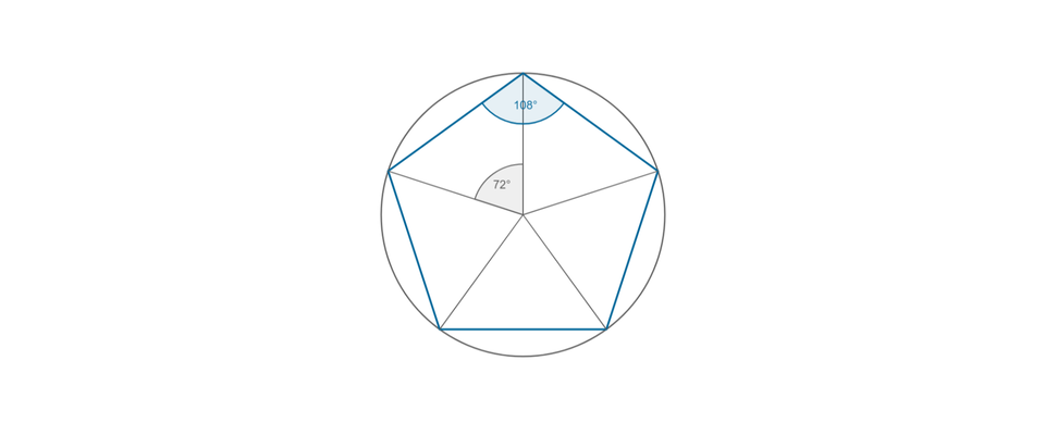 Dla n= 5 – pięciokąt foremny. Pięciokąt podzielono na pięć trójkątów o wspólnym wierzchołku w środku okręgu. Miarą kąta w trójkącie przy wierzchołku będącym środkiem okręgu wynosi 72 stopni. Miara kąta wewnętrznego pięciokąta to 108 stopni.