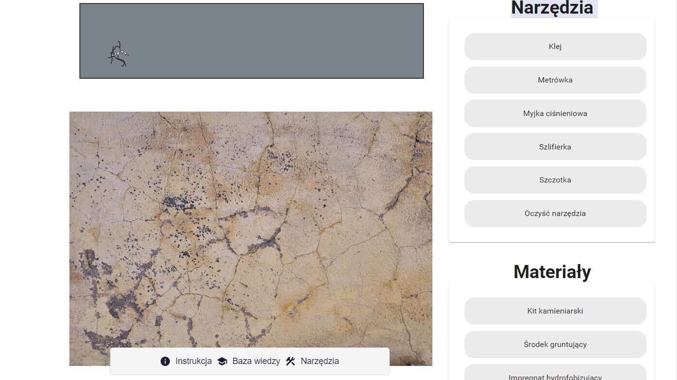 Twoim zadaniem będzie przeprowadzenie renowacji zabytkowej okładziny ceramicznej. Do każdego rodzaju uszkodzenia dobierz odpowiednie narzędzia i materiały, które wykorzystasz podczas prac renowacyjnych.