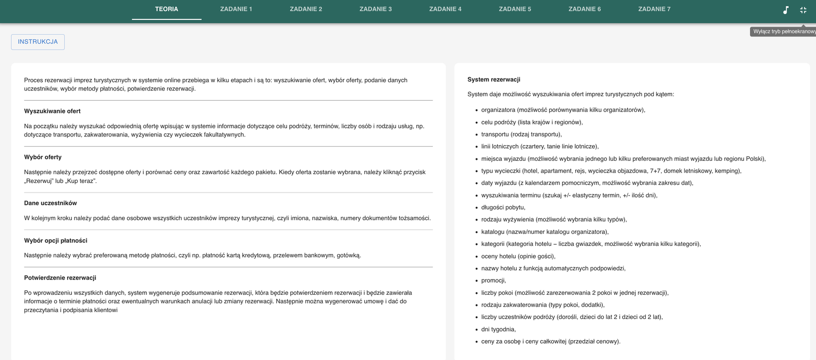 W części „Teoria” znajdują się opisy dotyczące zagadnień związanych z systemami rezerwacyjnymi, wyszukiwaniem ofert, potwierdzeniem rezerwacji.