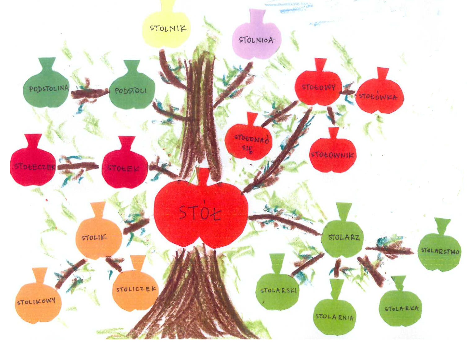 Uczniowie otrzymują tekst. Podkreślają wszystkie wyrazy, które – według nich – pochodzą od wyrazu stół. Zapisują je w formach podstawowych (słownikowych) na oddzielnych kartonikach, np. w kształcie jabłek.