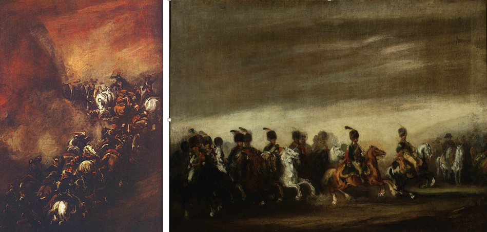 5. Jeźdźcy na pierwszym planie namalowani są grubymi impastowymi smugami, natomiast grupa sztabowców w głębi mają gładką fakturę.