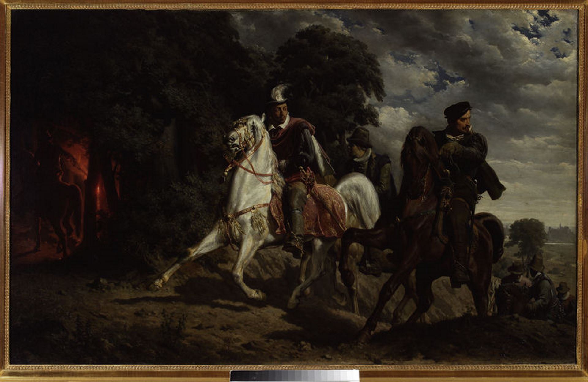 1. Ucieczka odbywa się nocą, jadącemu na białym koniu królowi towarzyszy kilku jeźdźców, a w tle na dalekim planie widać sylwetę Zamku na Wawelu