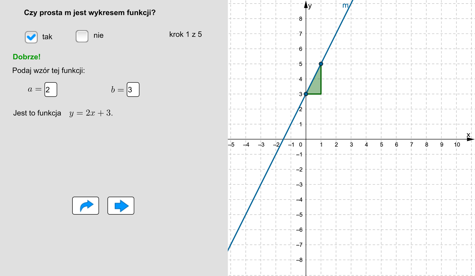 Z własności funkcji liniowej pamiętamy, że wykres funkcji przecina oś w punkcie o współrzędnych , a współczynnik kierunkowy jest równy .