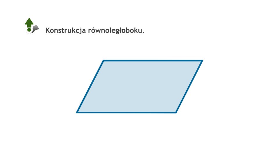 Animacja przedstawia sposób konstrukcji równoległoboku. Zaczynamy od narysowania odcinka A B, który stanowi podstawę równoległoboku. Rysujemy drugi odcinek o początku w punkcie A, który jest nachylony względem podstawy o dowolny kąt, oznaczamy go jako A C. Konstruujemy prostą równoległą do podstawy A B przechodzącą przez punkt C oraz prostą równoległą do odcinka A C przechodzącą przez punkt B. Punkt przecięcia tych prostych oznaczamy jako punkt D. W ten sposób otrzymaliśmy równoległobok A B C D.
