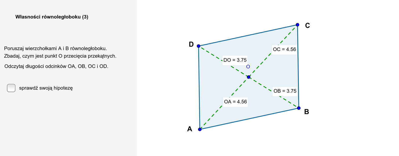 Zmieniaj położenie wierzchołków , i . Obserwuj, jak zmieniają się długości przekątnych i pod jakim kątem przecinają się przekątne.