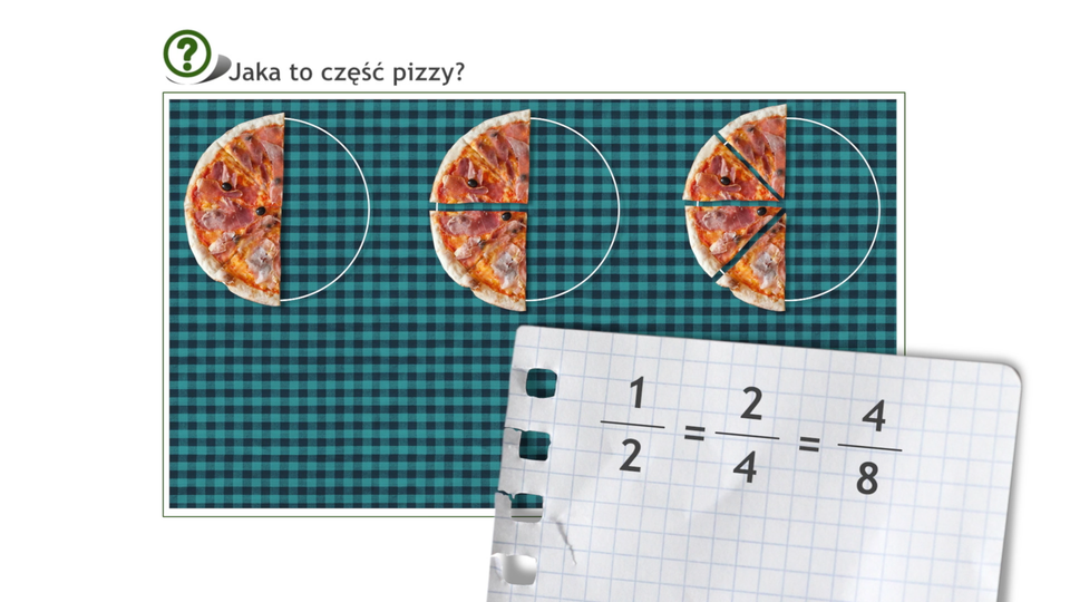Na każdym talerzu znajduje się taka sama część pizzy. Ułamki opisujące te części pizzy są równe.