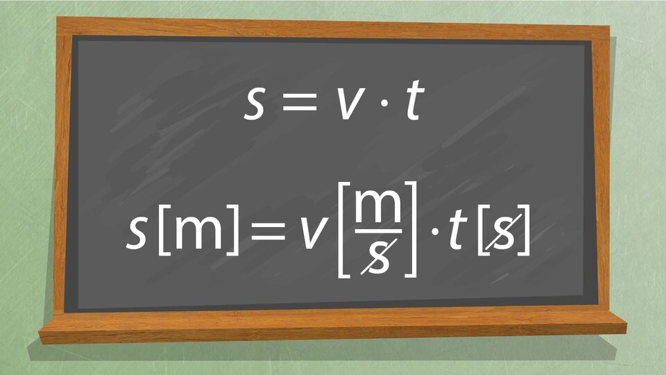 Ilustracja przedstawia wzór fizyczny zapisany na tablicy szkolnej. Jest to wzór na drogę: es równa się fał razy te. Poniżej rachunek jednostek: droga w metrach równa się prędkość w metrach na sekundę razy czas w sekundach. Sekundy skracają się, a więc zostaje jednostka metr - zgadza się.