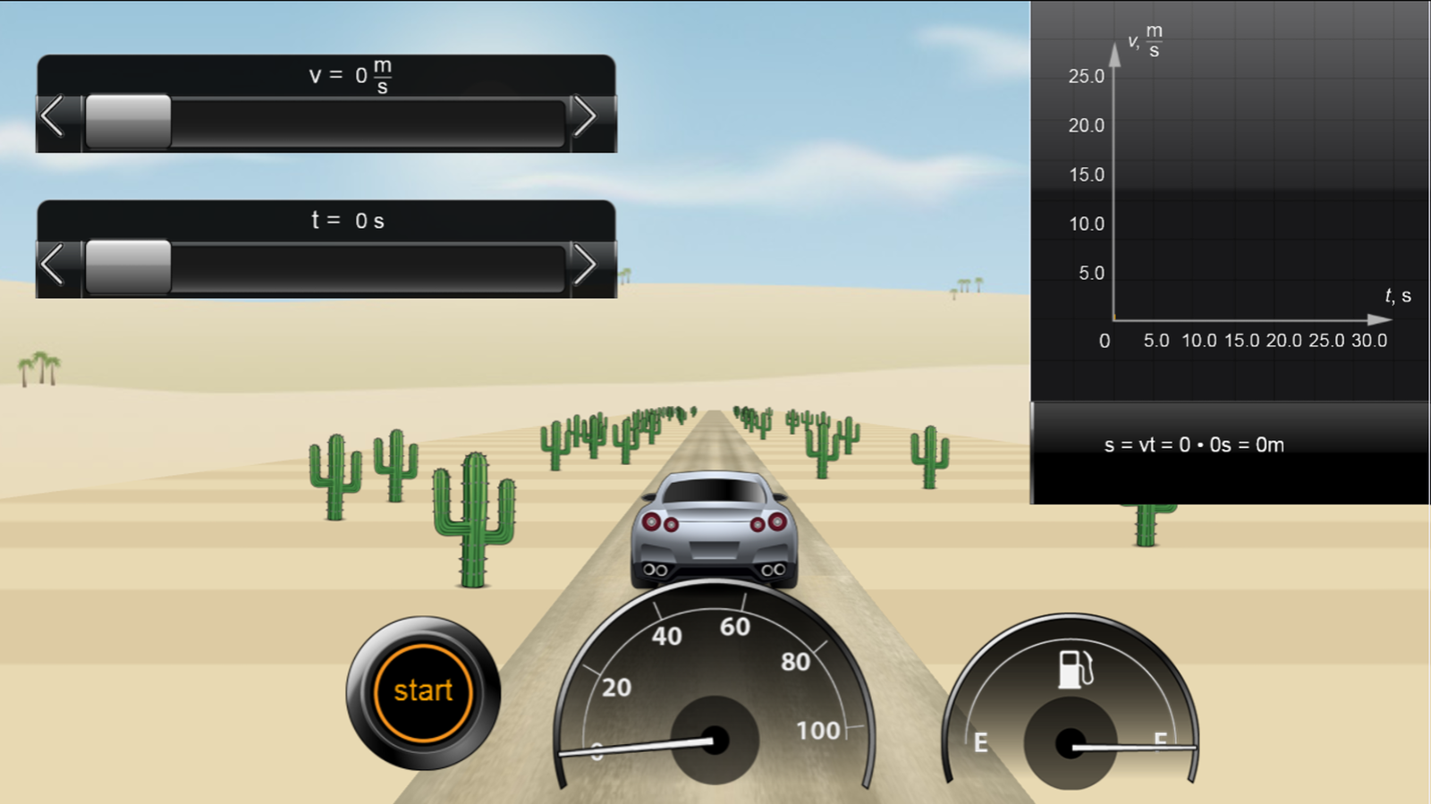 Aplikacja posiada możliwość zmiany wartości prędkości pojazdu oraz czasu jego poruszania się. Po ustawieniu tych wartości, widoczny na ekranie samochód zaczyna poruszać się w linii prostej do przodu. W prawym górnym rogu pojawia się wykres zależności prędkości od czasu. Jest on linią prostą, równoległą do osi czasu.