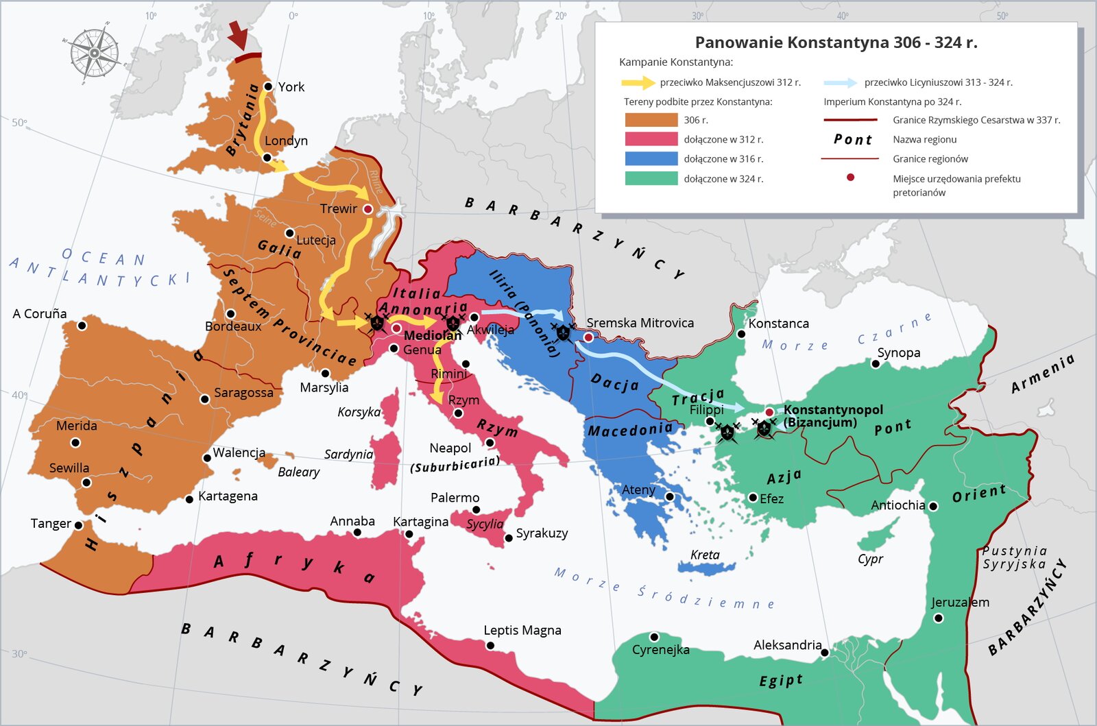 Mapa interaktywna przedstawiająca panowanie Konstantyna. Lądy zdobyte zaznaczono kolorami pomarańczowym, różowym, niebieskim oraz zielonym, a należące do Konstantyna - szarym. Morze Śródziemne zaznaczono oraz opisano kolorem jasnoniebieskim. Granice cesarstwa zaznaczono grubszą linią w kolorze ciemnej czerwieni. Bitwy oznaczono tarczą ze skrzyżowanymi mieczami, a miasta i ważne miejsca kropką. W prawym górnym rogu umieszczono legendę. W celu obejrzenia prezentacji należy kliknąć na biały trójkąt, znajdujący się w szarym kółku. Na mapie znajdują się również punkty interaktywne takie jak Wał Hadriana - system murów obronnych, wybudowanych w Brytanii w latach 121‑129, mający chronić ziemie podporządkowane przez Rzymian przed atakami plemion brytyjskich z północy. Mediolan- W 313 roku Konstantyn wraz z Licyniuszem ogłosili w Mediolanie edykt, który zapewniał wolność wyznania na obszarze całego cesarstwa (tzw. edykt mediolański). To przełomowe wydarzenie pozwoliło na swobodne wyznawanie chrześcijaństwa. Konstantynopol- Jedną z najważniejszych decyzji Konstantyna było założenie nowego miasta – Konstantynopola („miasta Konstantyna”, dzisiejszy Stambuł). Powstało ono nad Bosforem, na miejscu greckiej kolonii Byzantion (stąd późniejsza nazwa nadana przez historyków całej wschodniej części podzielonego cesarstwa). Konstantynopol prężnie się rozwijał, wkrótce nazywany był „nowym Rzymem” (łac. Roma Nova), stając się wkrótce rzeczywistą stolicą cesarstwa.