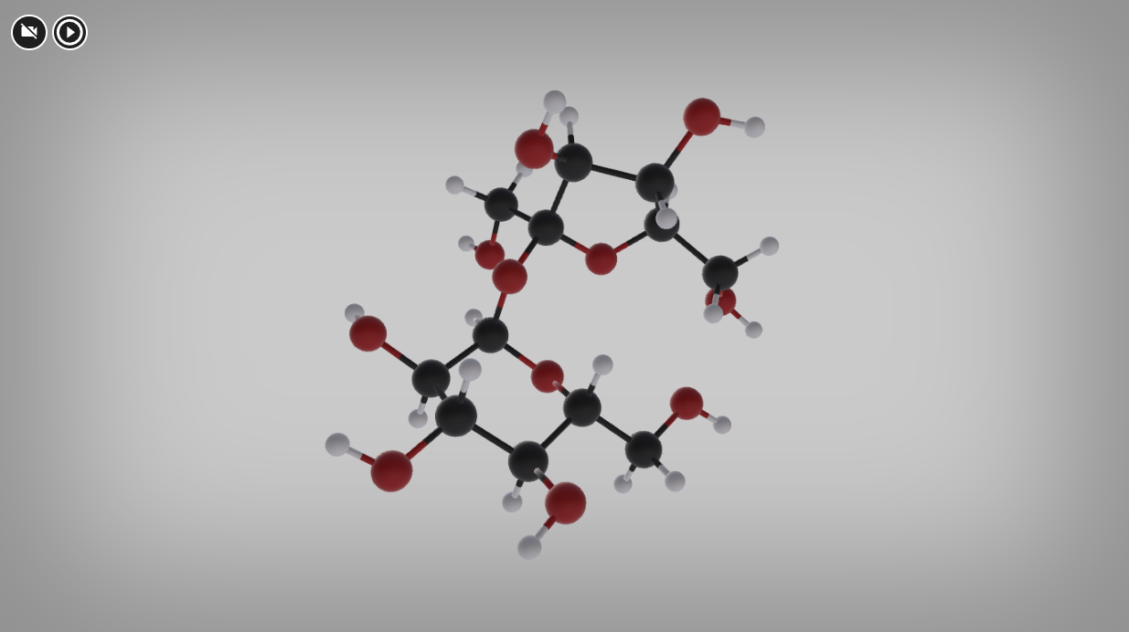 Poniżej przedstawiono model cząsteczki sacharozy. Przeanalizuj jej budowę, obracając cząsteczkę za pomocą myszy, a następnie wykonaj ćwiczenia.
