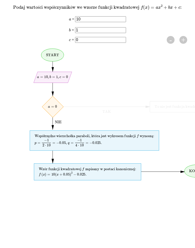 W poniższym schemacie przygotuj algorytm zamieniający wzór funkcji kwadratowej postaci na postać kanoniczną .