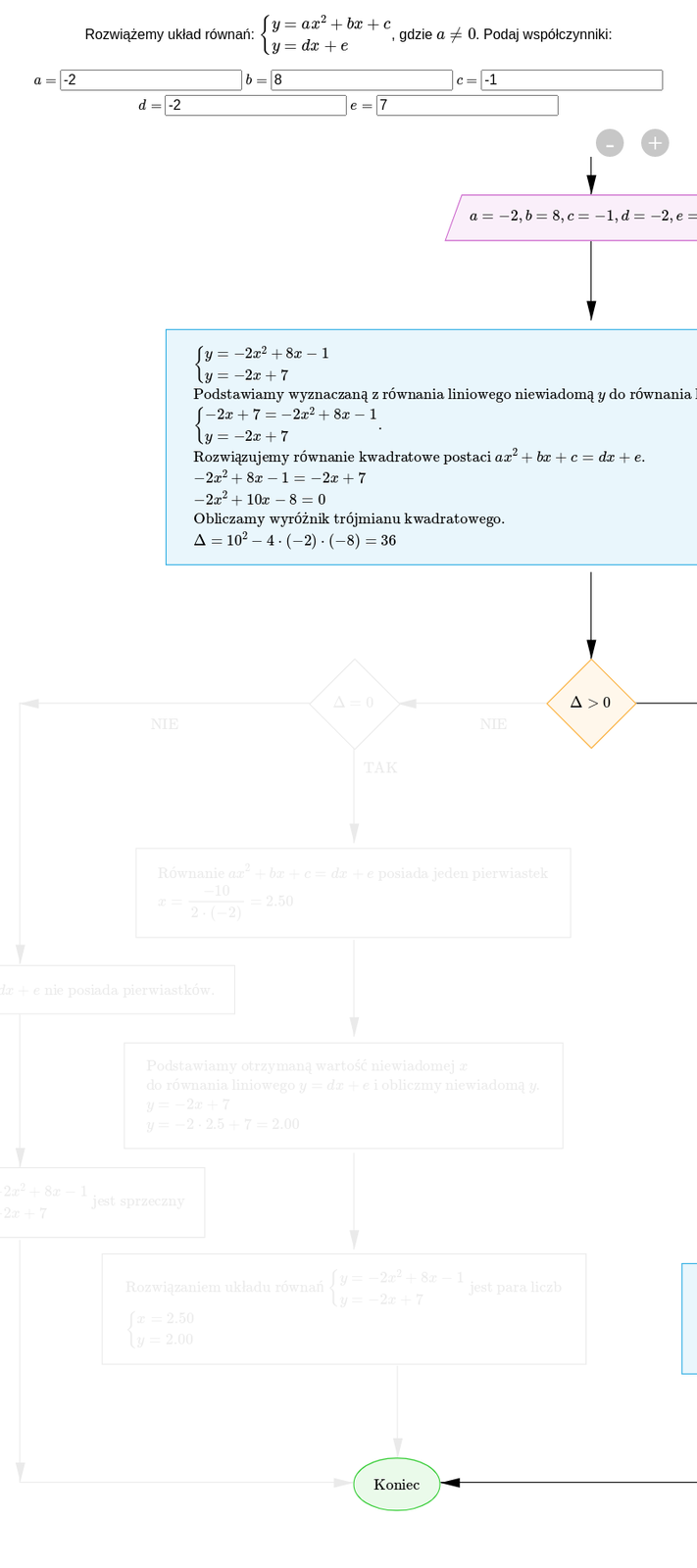 Schemat przedstawia metodę rozwiązywania układów równań typu , gdzie a jest różne od zera. Wybieramy następujące współczynniki , , , , . Schemat rozpoczyna blokiem z napisem START. Z tego bloku prowadzi strzałka do bloku wprowadzania danych, z następującymi danymi: , , , , . Dalej prowadzi strzałka do bloku wykonywania działań, gdzie znajdują się następujące wyrażenia: . Podstawiamy wyznaczoną z równania liniowego niewiadomą y do równania kwadratowego. Otrzymujemy układ równań: . Następnie rozwiązujemy równanie kwadratowe postaci : , . Obliczamy wyróżnik trójmianu kwadratowego: . Następna strzałka prowadzi do bloku sprawdzania warunku z zapisem: . Dalej w prawo prowadzi strzałka z podpisem TAK, w kolejnym bloku znajdują się zapisy: Równanie posiada dwa pierwiastki lub . Kolejna strzałka prowadzi do bloku z zapisem: Podstawiamy otrzymane wartości niewiadomej x do równania liniowego i obliczymy niewiadomą y: , lub . Kolejna strzałka prowadzi do bloku z zapisem: Rozwiązaniem układu równań: są pary liczb lub . Ostatnia strzałka prowadzi do bloku z napisem KONIEC. Wybieramy następujące współczynniki , , , , . Schemat rozpoczyna blokiem z napisem START. Z tego bloku prowadzi strzałka do bloku wprowadzania danych, z następującymi danymi: , , , , . Dalej prowadzi strzałka do bloku wykonywania działań, gdzie znajdują się następujące wyrażenia: . Podstawiamy wyznaczoną z równania liniowego niewiadomą y do równania kwadratowego. Otrzymujemy układ równań: . Następnie rozwiązujemy równanie kwadratowe postaci : , . Obliczamy wyróżnik trójmianu kwadratowego: . Następna strzałka prowadzi do bloku sprawdzania warunku z zapisem: . Dalej w lewo prowadzi strzałka z podpisem NIE, prowadzi ona do kolejnego bloku sprawdzającego warunek . Stąd prowadzi strzałka z podpisem TAK do bloku z zapisem: Równanie posiada jeden pierwiastek . Kolejna strzałka prowadzi do bloku z zapisem: Podstawiamy otrzymaną wartość niewiadomej x do równania liniowego i obliczymy niewiadomą y: , . Do następnego bloku również prowadzi strzałka, w bloku tym znajduje się zapis: Rozwiązaniem układu równań jest para liczb: . Ostatnia strzałka prowadzi do bloku z napisem KONIEC. Wybieramy następujące współczynniki , , , , . Schemat rozpoczyna blokiem z napisem START. Z tego bloku prowadzi strzałka do bloku wprowadzania danych, z następującymi danymi: , , , , . Dalej prowadzi strzałka do bloku wykonywania działań, gdzie znajdują się następujące wyrażenia: . Podstawiamy wyznaczoną z równania liniowego niewiadomą y do równania kwadratowego. Otrzymujemy układ równań: . Następnie rozwiązujemy równanie kwadratowe postaci : , . Obliczamy wyróżnik trójmianu kwadratowego: . Następna strzałka prowadzi do bloku sprawdzania warunku z zapisem: . Dalej w lewo prowadzi strzałka z podpisem NIE, prowadzi ona do kolejnego bloku sprawdzającego warunek . Stąd prowadzi strzałka z podpisem NIE do bloku z zapisem: Równanie nie posiada pierwiastków. W kolejnym bloku jest zapis: Układ równań: jest sprzeczny. Ostatnia strzałka prowadzi do bloku z napisem KONIEC.