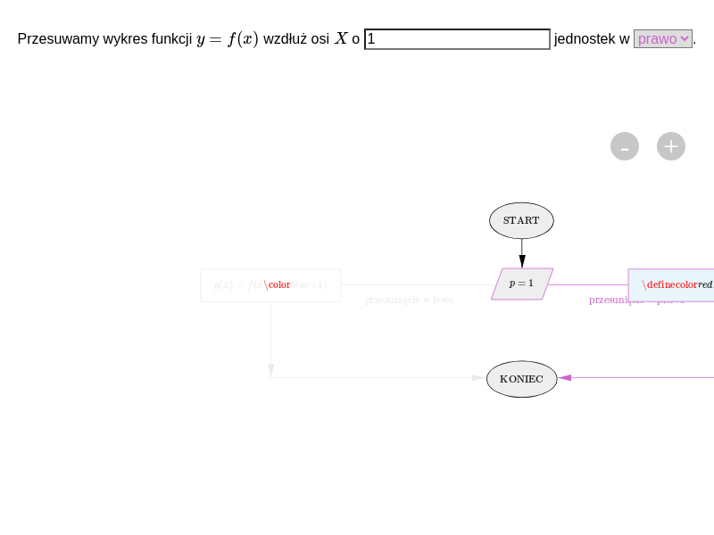 W poniższym schemacie przygotuj algorytm pokazujący jak zmienia się wzór funkcji, gdy podasz liczbę jednostek przesunięcia i w którą stronę należy przesunąć wykres (w prawo lub w lewo).