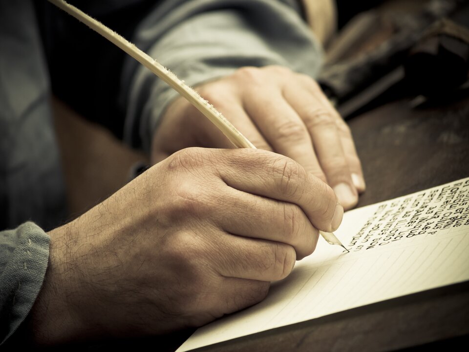 Kolorowa interaktywna ilustracja ukazuje dłonie mężczyzny piszącego gęsim piórem. Widoczny jest fragment kartki oraz czarne, wykaligrafowane litery. Do ilustracji dołączona jest informacja: 1. Ostatni ślad używania not tyrońskich datowany jest na XI wiek.