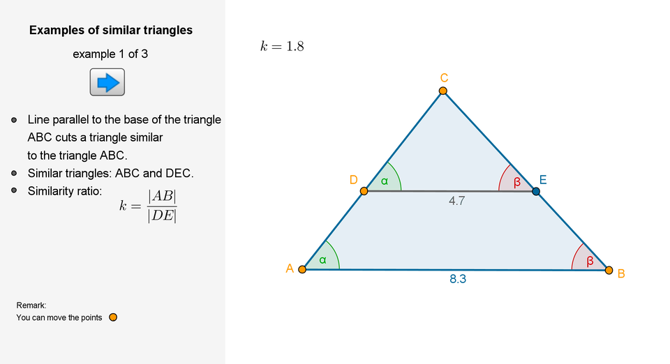 Open Geogebra applet - „Examples of similar trianglessimilar trianglessimilar triangles” and observe three examples of similar trianglessimilar trianglessimilar triangles, which are commonly used in geometry tasks.