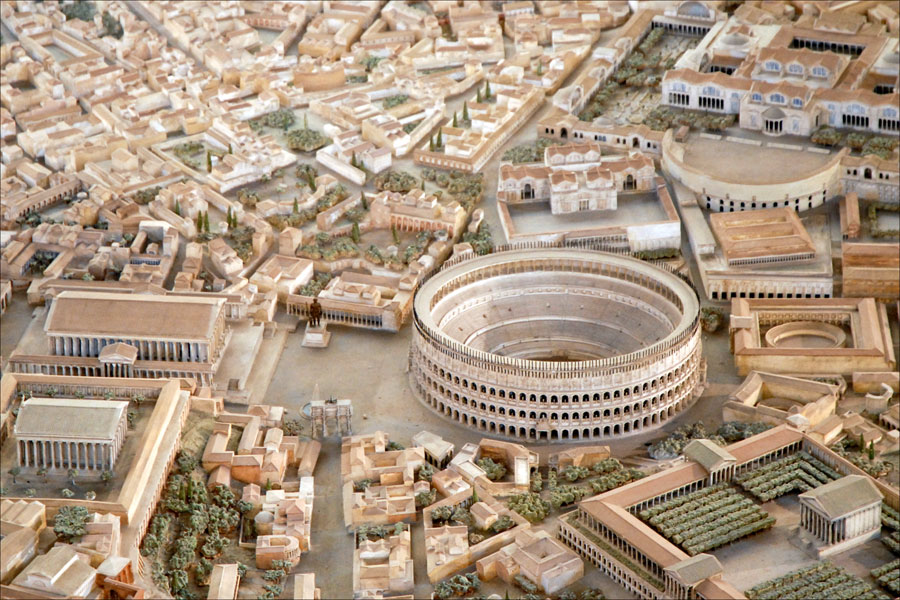 Rzym - miasto nad Tybrem, w Lacjum (Włochy środkowe); w starożytności ośrodek i stolica republiki i cesarstwa rzymskiego, zwanych również Rzymem. Wg źródeł pisanych Rzym założony został przez legendarnego Romulusa W 753 r. p.n.e. Rzym rozbudował się wspaniale u schyłku republiki (II i I w. p.n.e.) i w okresie cesarstwa. Za panowania Nerona w 64 pożar strawił znaczną część miasta, które następcy cesarza z rozmachem rozbudowali. Po upadku gospodarczym zachodniej części cesarstwa rzymskiego w IV-V w. nastąpił upadek Rzymu, zwłaszcza po założeniu Konstantynopola i przeniesieniu stolicy cesarzy Zachodu do Rawenny.