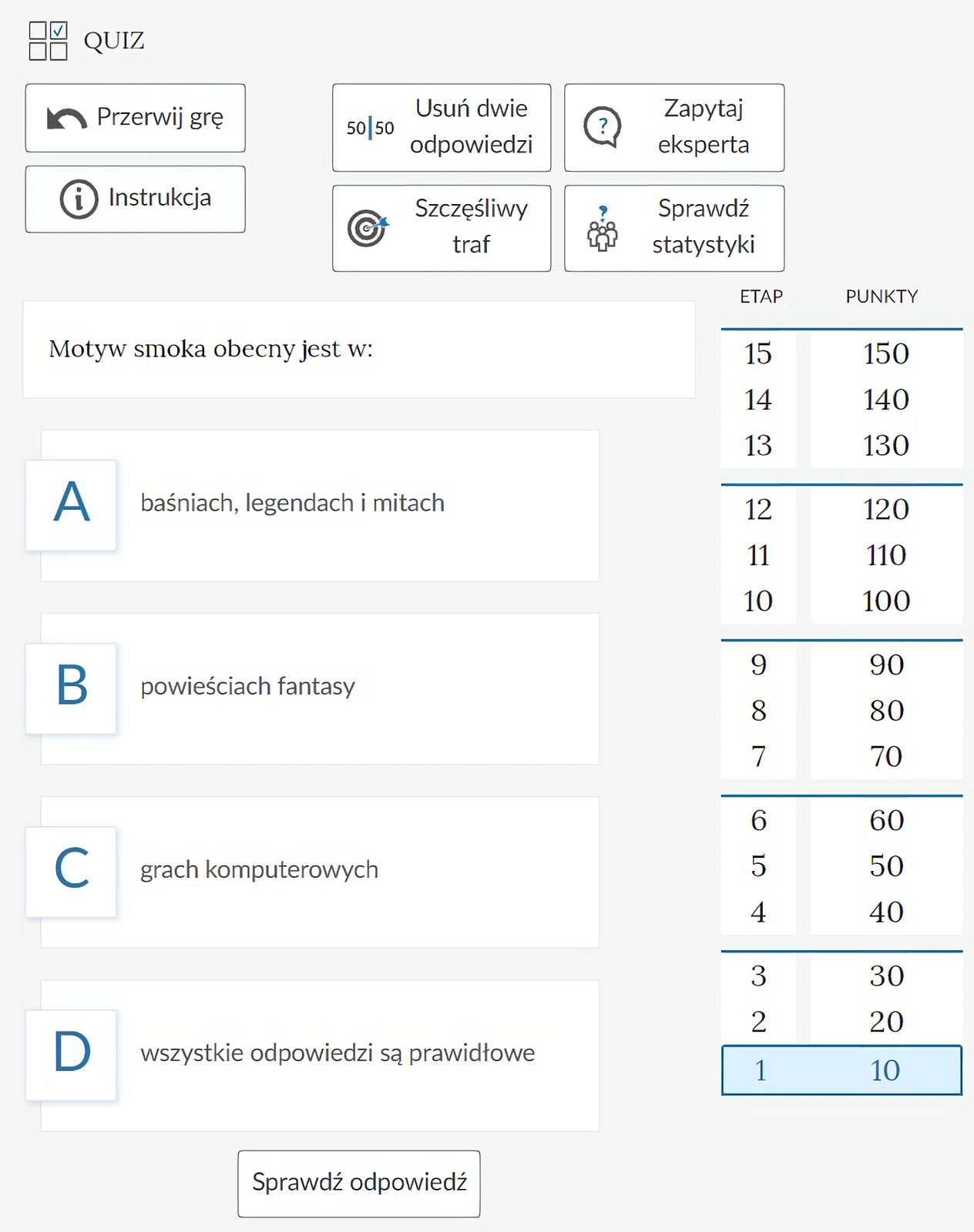 Informacja dla osób korzystających z czytnika ekranu NVDA - po aplikacji można poruszać się przy użyciu klawiszy Tab i Shift + Tab, aby przejść przez poszczególne przyciski oraz strzałkami aby przejść przez poszczególne odpowiedzi każdego z pytań quizu.