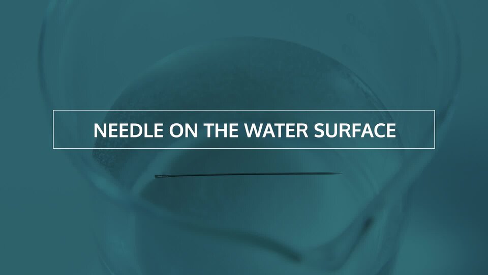 Nagranie filmowe dotyczące eksperymentu. Film obrazujący napięcie powierzchniowe wody. Needle on the water surface. Potrzebne dwie igły, dwie zlewki z wodą, mydło w płynie i bagietka do mieszania. Na powierzchni wody w jednej ze zlewek kładziemy delikatnie igłę. Utrzymuje się na powierzchni. Do drugiej zlewki z wodą dodajemy mydło w płynie. Igła opada na dno.