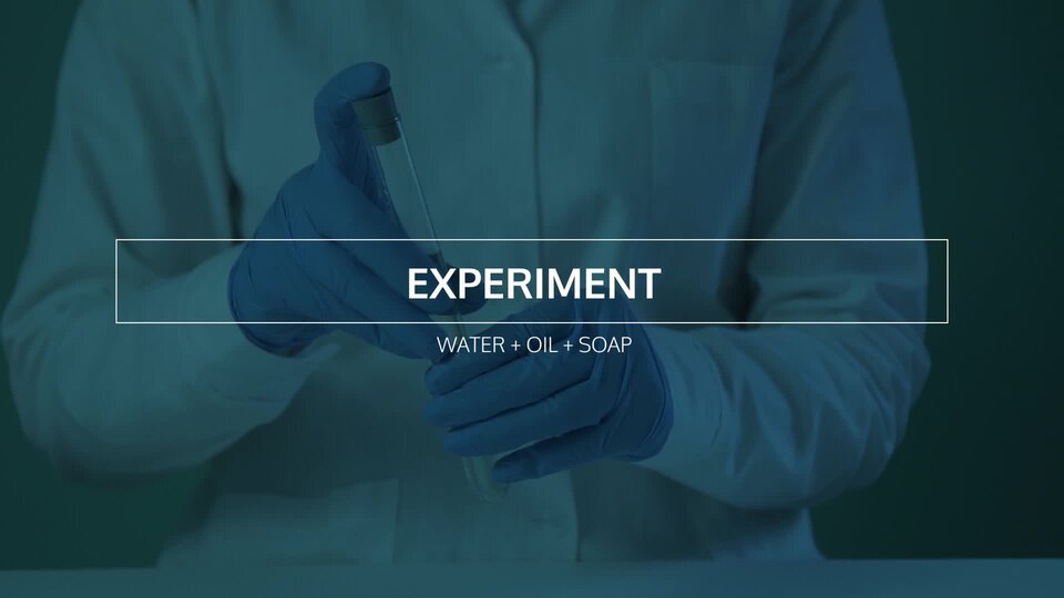 Film pokazuje eksperyment. Dwie probówki: w jednej woda, w drugiej roztwór mydła. Do wody dodajemy olej. Zatykamy korkiem probówkę. Przechylamy probówkę w celu wymieszania. Olej nie miesza się z wodą – unosi się na jej powierzchni. Do drugiej probówki z mydłem również dodajemy olej. Po wymieszaniu w probówce tworzy się piana.