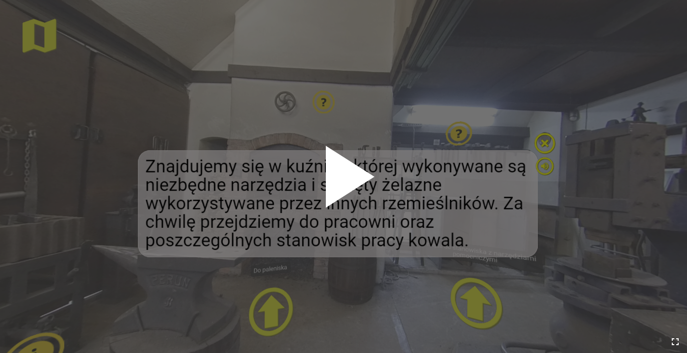Po wyłączeniu banneru znajdujemy się w pracowni kowalskiej, w której wszystkie miejsca opisane są punktami interaktywnymi. Po kliknięciu każdego z nich wyświetla się treść, którą również można odsłuchać w wersji audio. Są to miejsca:
