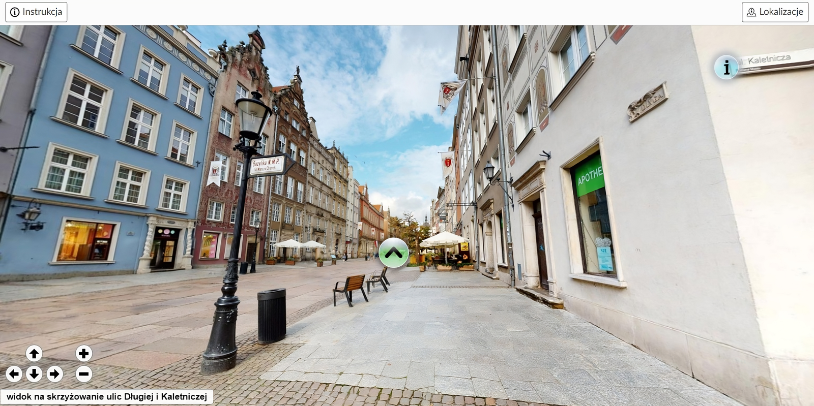 Po jego naciśnięciu, znajdujemy się na ulicy prostopadłej do Kaletniczej. Z tabliczki na budynku dowiadujemy się, że to ul. Długa. Przy niej niebieskie koło z literą „i”. Po naciśnięciu przycisku, pojawia się zdjęcie przedstawiające budynek, na ścianach których znajduje się tabliczka z napisem „ulica Kaletnicza” oraz „Długa”. Przy skrzyżowaniu z ulicą Kaletniczą znajduje się lampa z tabliczką wskazującą na ulicę Kaletniczą z napisami: bazylika N.M.P. oraz St Mary’s Church. Przy lampie dwie ławki oraz śmietnik. Po obu stronach ulicy Długiej ozdobne, kilkupiętrowe różnokolorowe kamienice. Przy niektórych stoją duże parasole z miejscami do siedzenia i ze stołami. Ulicą spacerują ludzie. Obracając się do tyłu również widzimy różnokolorowe ozdobne kamienice i ogródki restauracyjne. Po lewej stronie ulicy widać duży budynek z czerwonej cegły, z wysoką wieżą i zegarem na niej. Obracamy się znowu do tyłu i za pomocą przycisku: Przejdź do: widok na skrzyżowanie ulic Elizy Orzeszkowej i Dębowej przechodzimy w zupełnie inny rejon miasta.